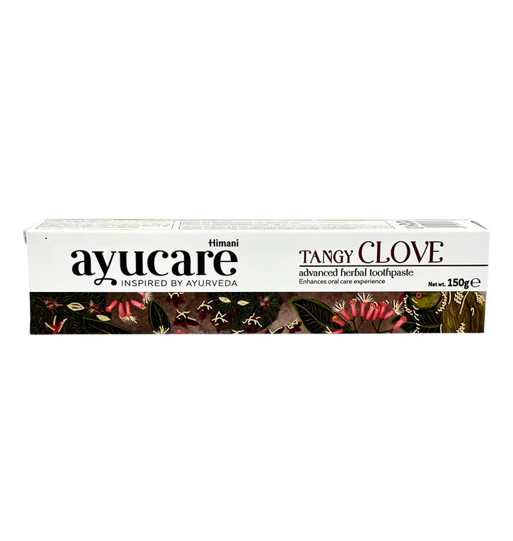 Zeliščna zobna pasta brez fluorida s klinčki Ayucare Tangy Clove združuje ajurvedsko znanje za celovito ustno nego. Vsebuje naravne izvlečke klinčkov in druge rastlinske sestavine, ki pomagajo preprečevati zobno gnilobo, krepijo dlesni in odpravljajo zadah, hkrati pa zagotavljajo naravno svežino s pikantnim okusom.
