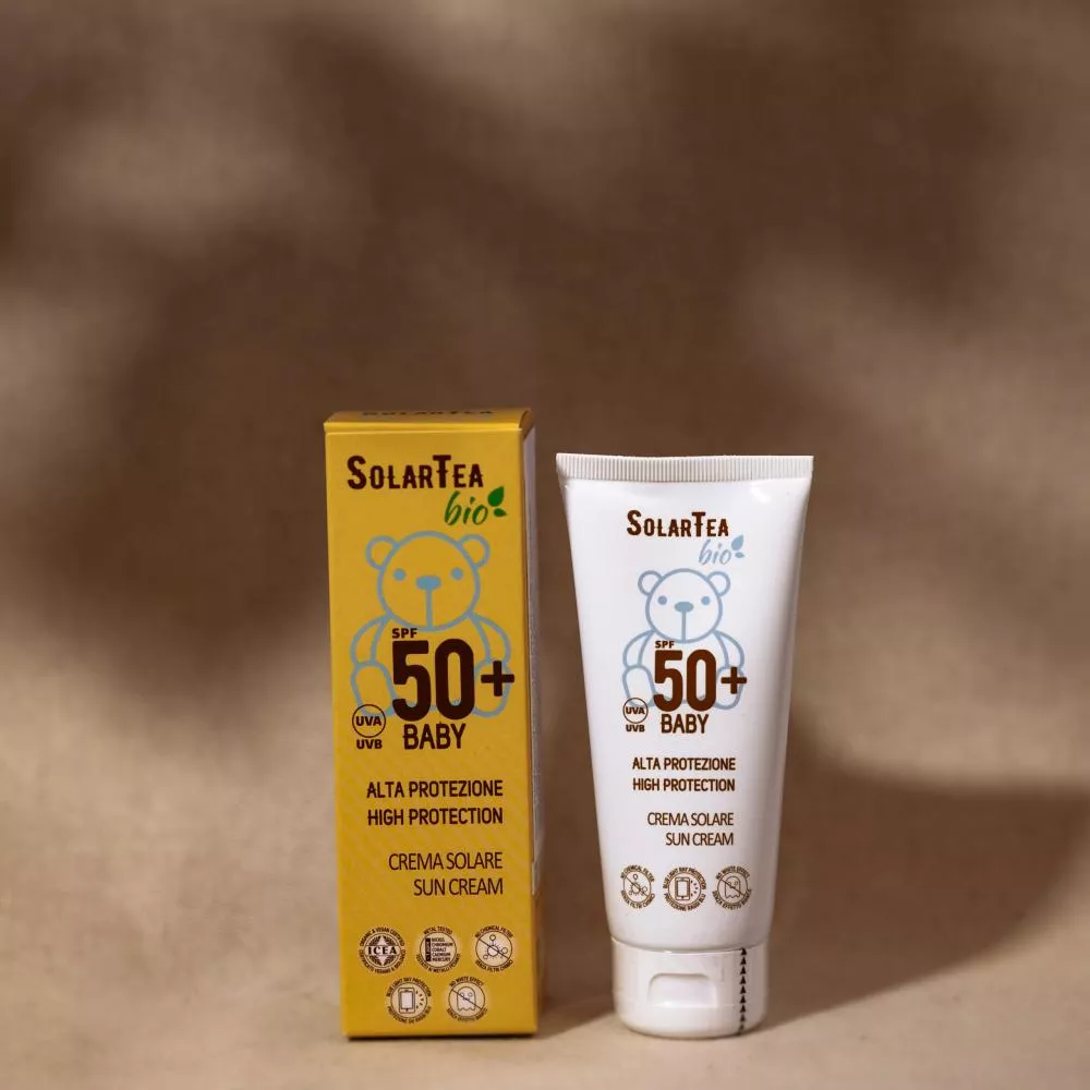 Certificirana ekološka Solar Tea krema za sončenje ZF 50+ Baby je obogatena z naravnimi mineralnimi filtri in rastlinskimi ekstrati z zelo visokim zaščitnim faktorjem. Primerna za zaščito nežne, otroške kože.