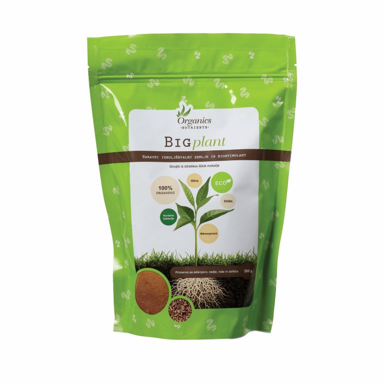 Big plant – Naravni izboljševalec zemlje in 100%naraven biostimulant vsebuje vrsto mikro in makro hranil za vaše rastline. Gnojilo je v celoti sestavljeno iz iztrebkov mokarjev. Vsebuje koristne mikroorganizme, bakterije, ter glive, ki močno izboljšajo koreninski sistem.
